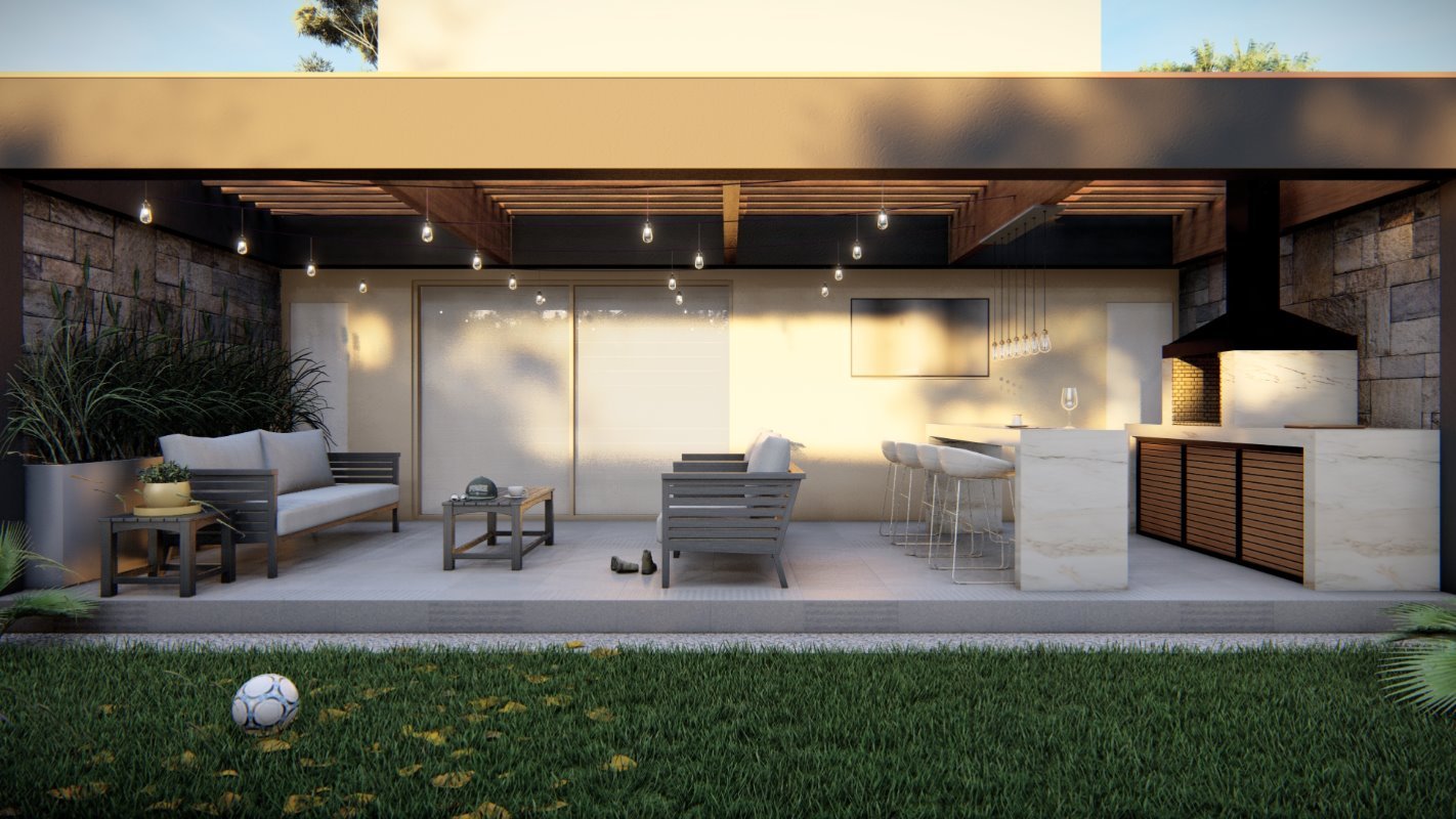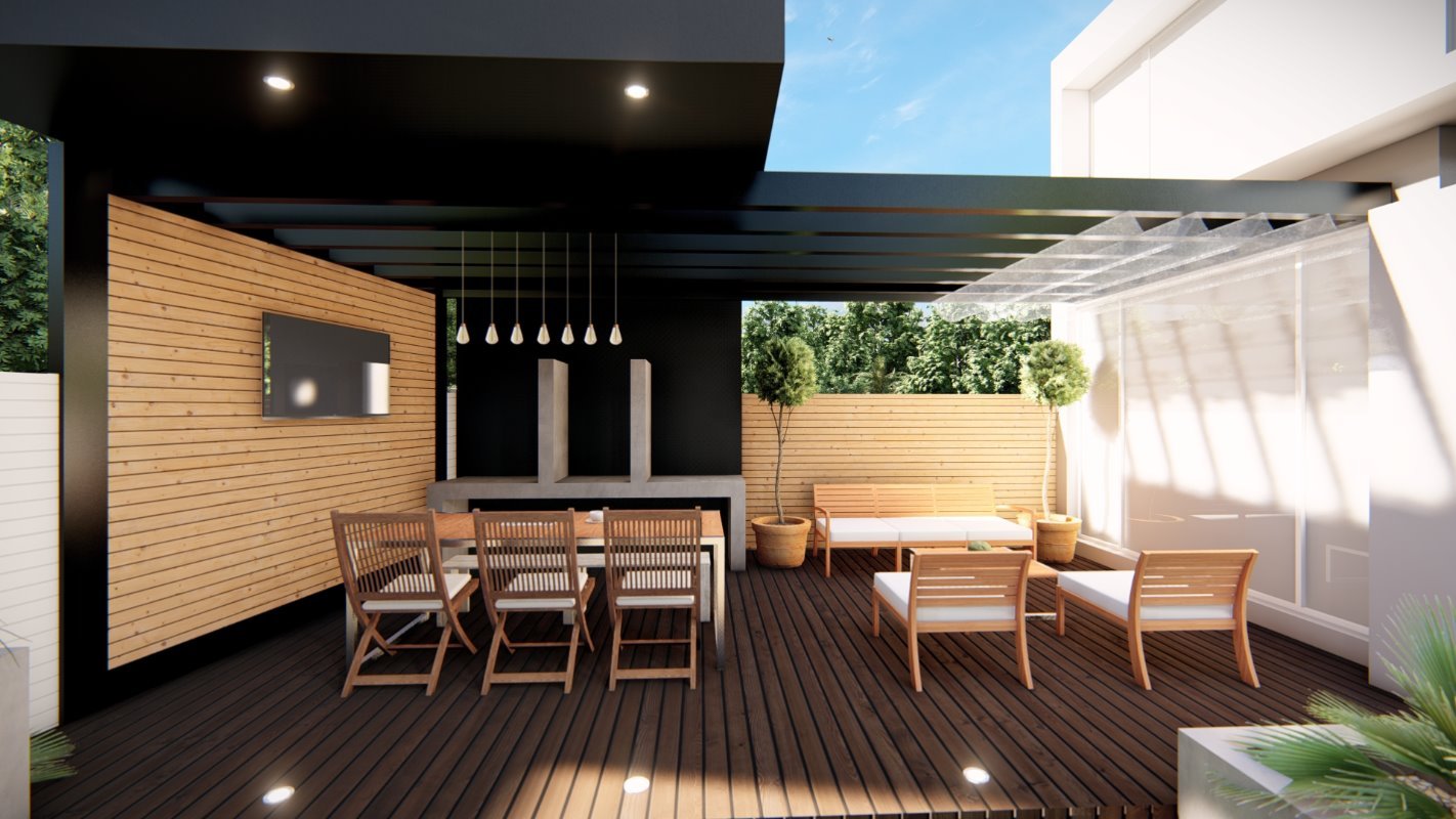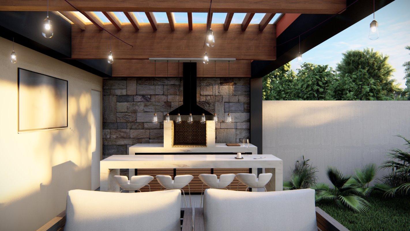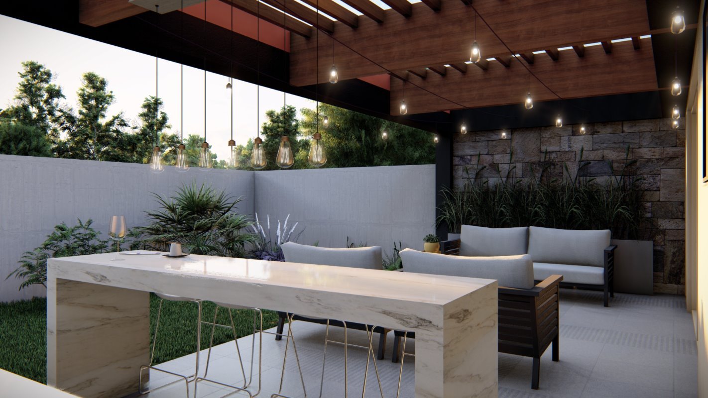 Se diseña un radier de lado a lado de la propiedad donde se ubican el quincho junto con una isla y un living exterior. El estilo es continuidad de la casa y la cubierta se diseña con la pendiente oculta.