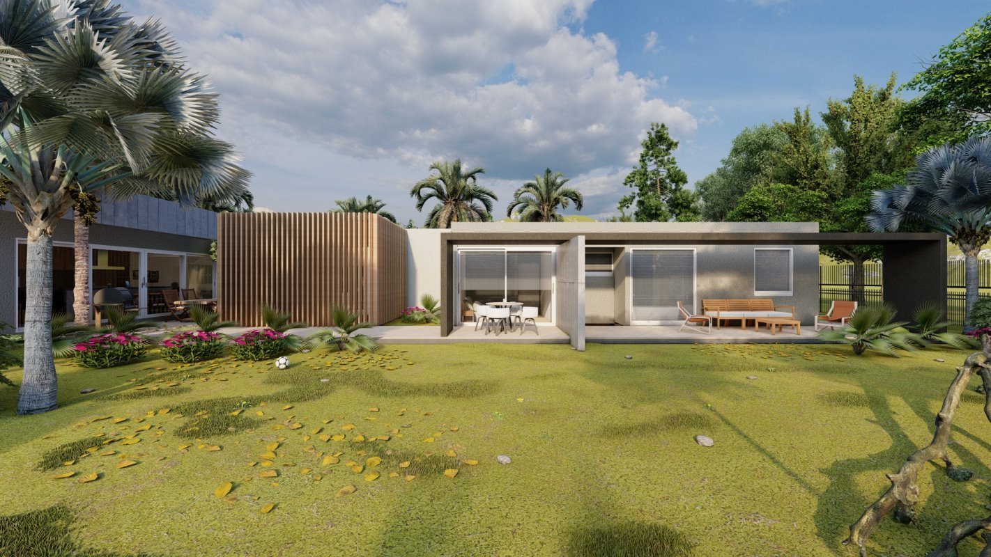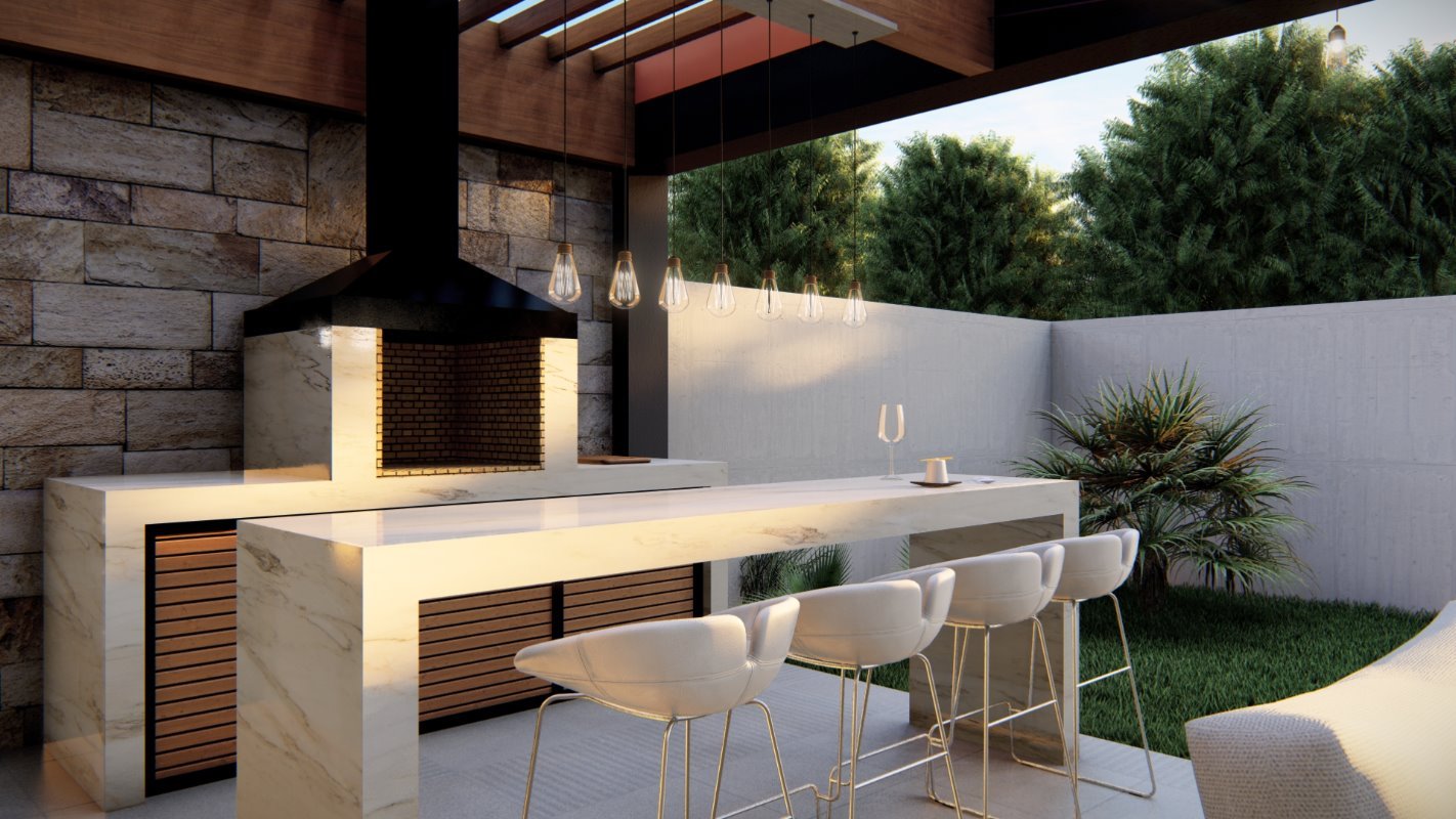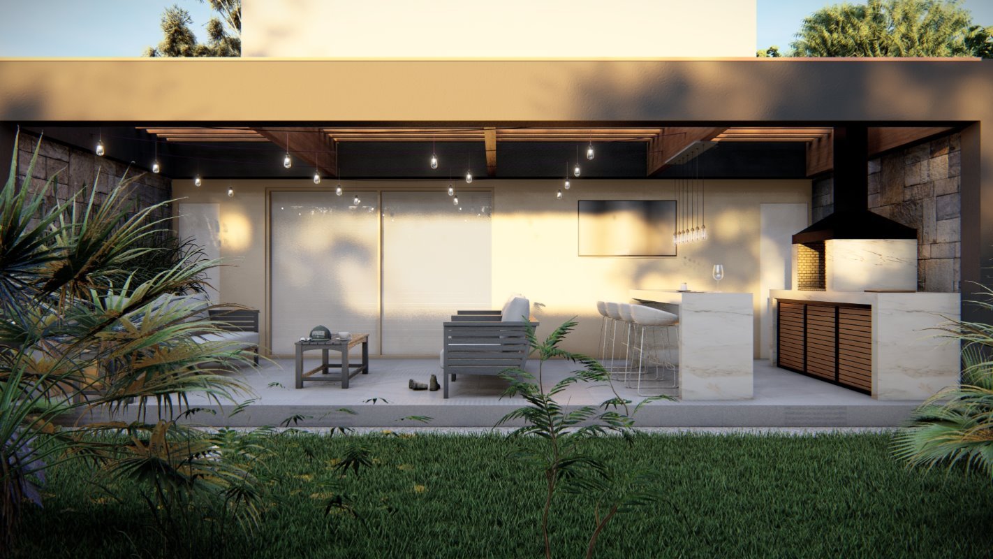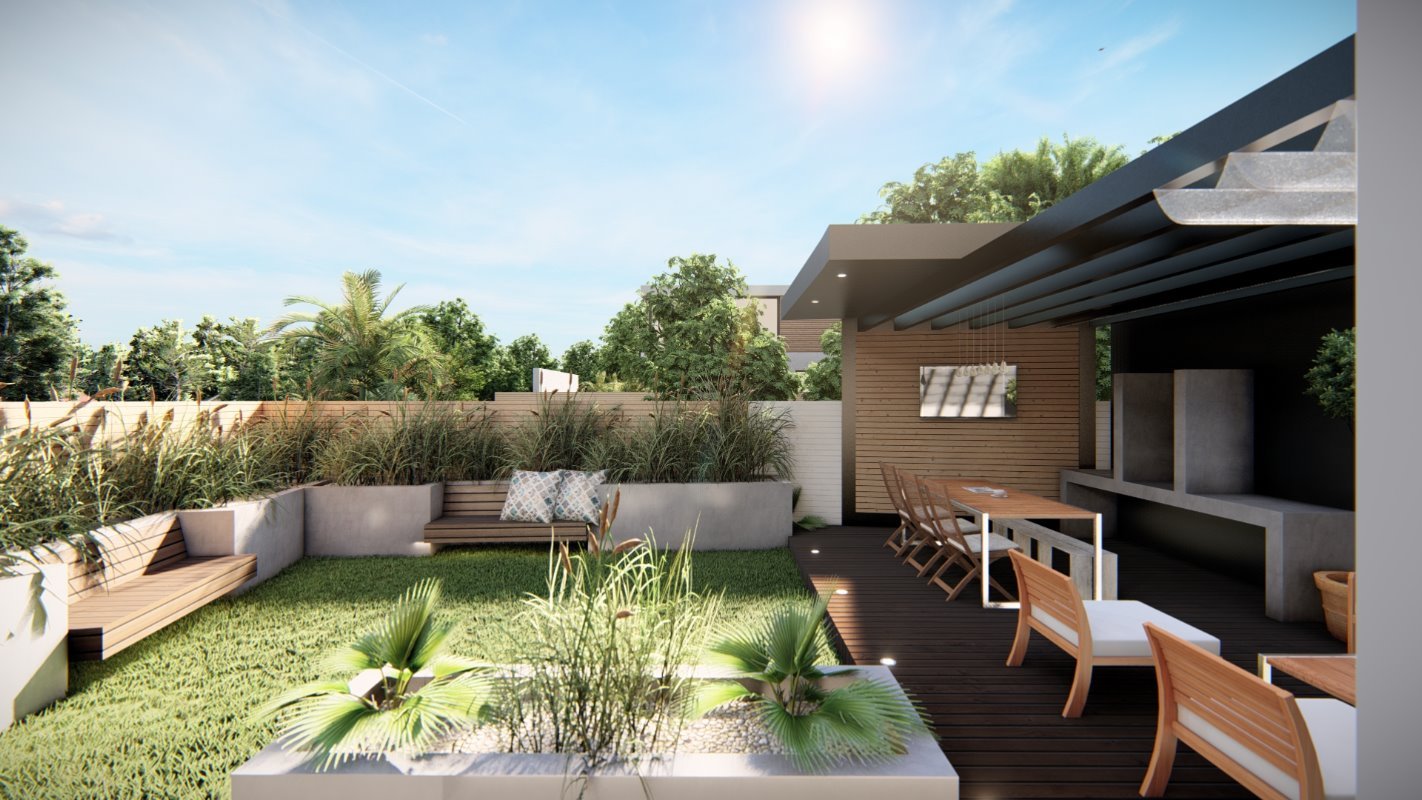 Se diseña un radier de lado a lado de la propiedad donde se ubican el quincho junto con una isla y un living exterior. El estilo es continuidad de la casa y la cubierta se diseña con la pendiente oculta.