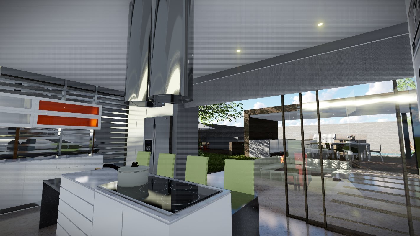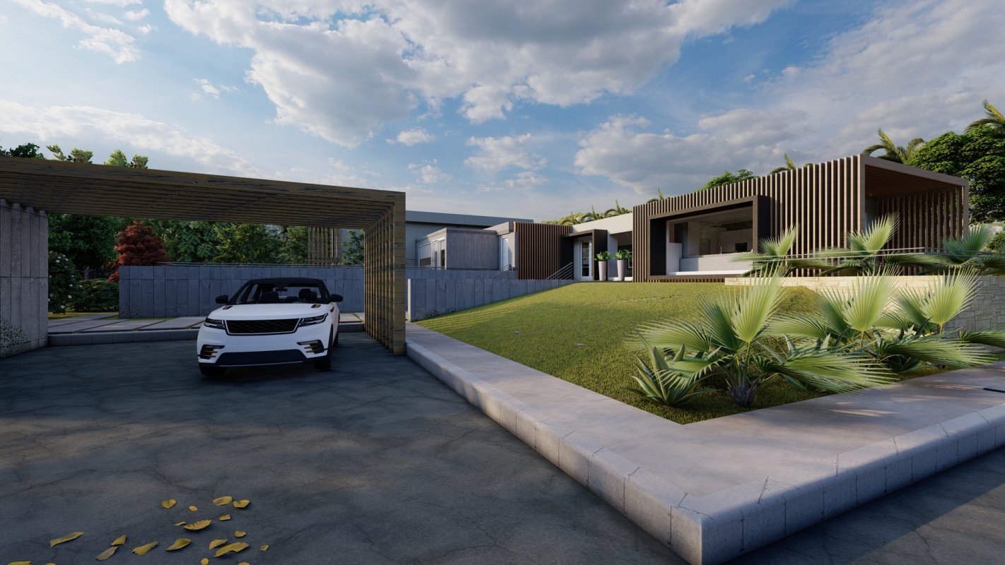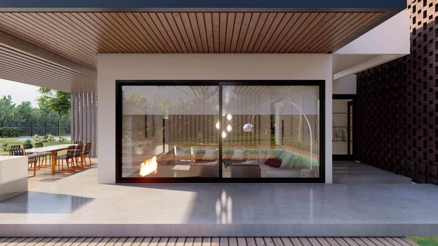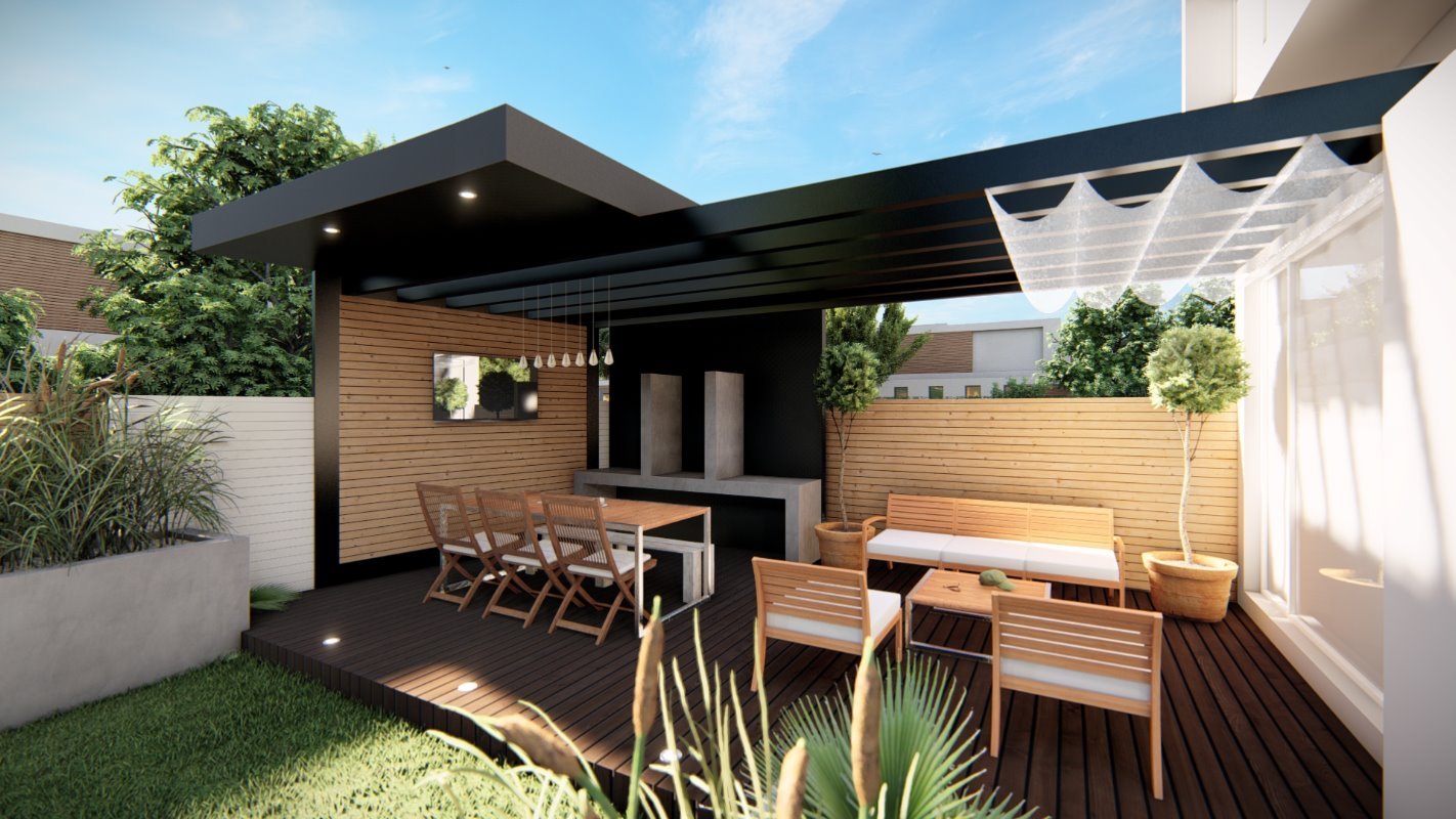 Se diseña un radier de lado a lado de la propiedad donde se ubican el quincho junto con una isla y un living exterior. El estilo es continuidad de la casa y la cubierta se diseña con la pendiente oculta.