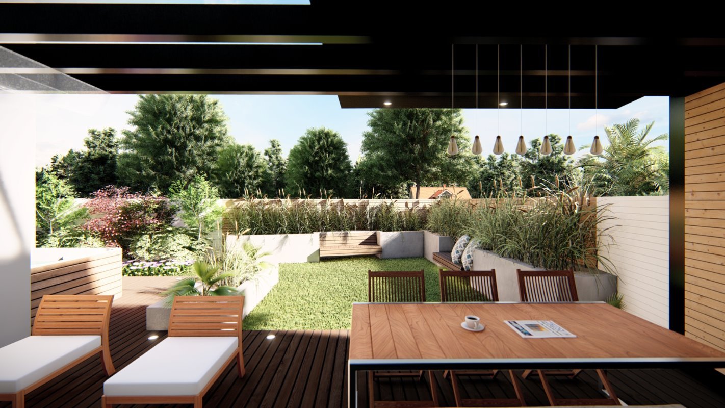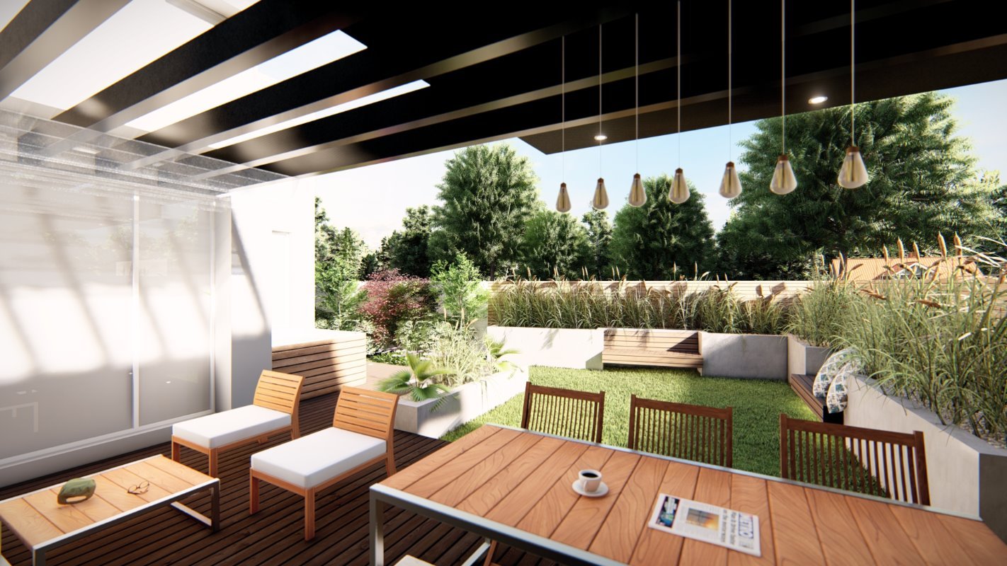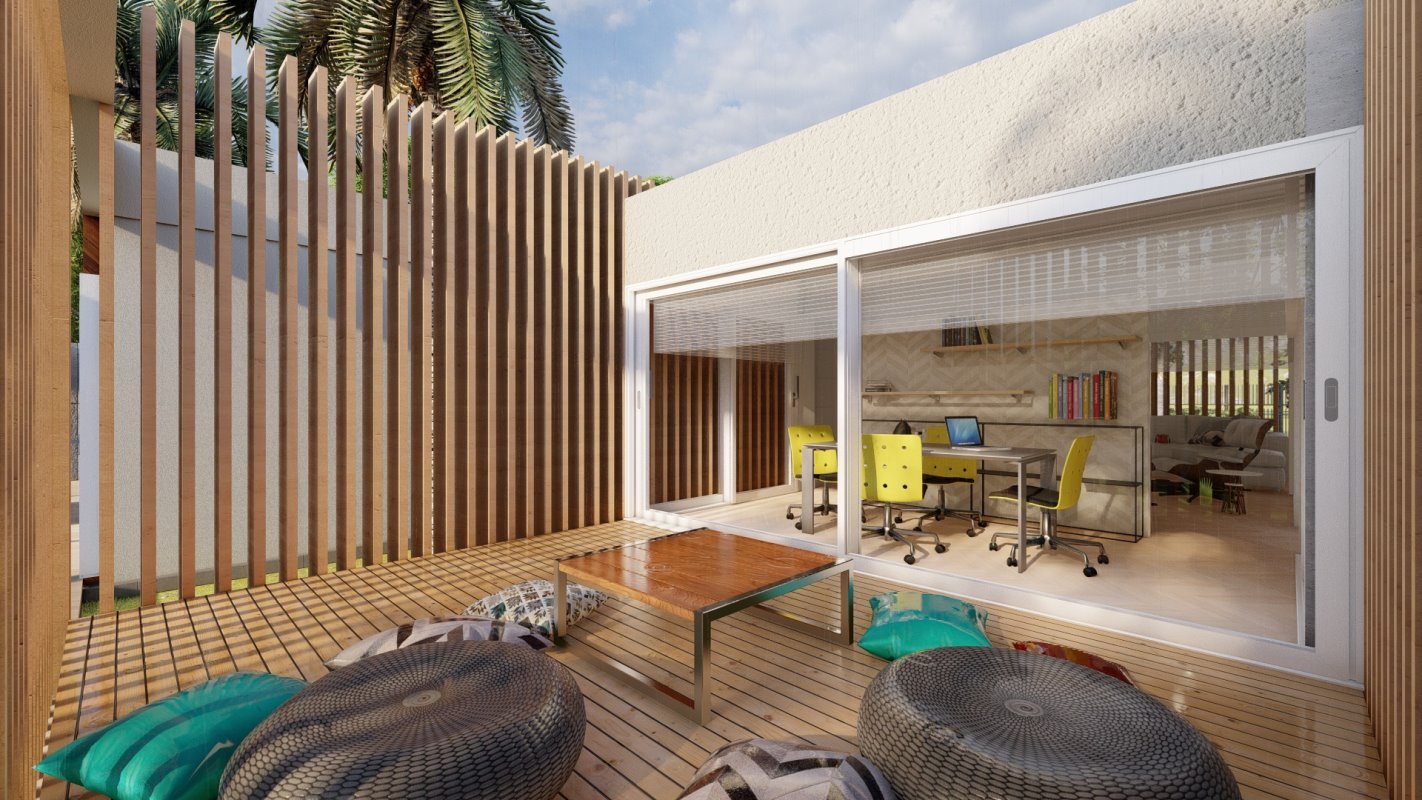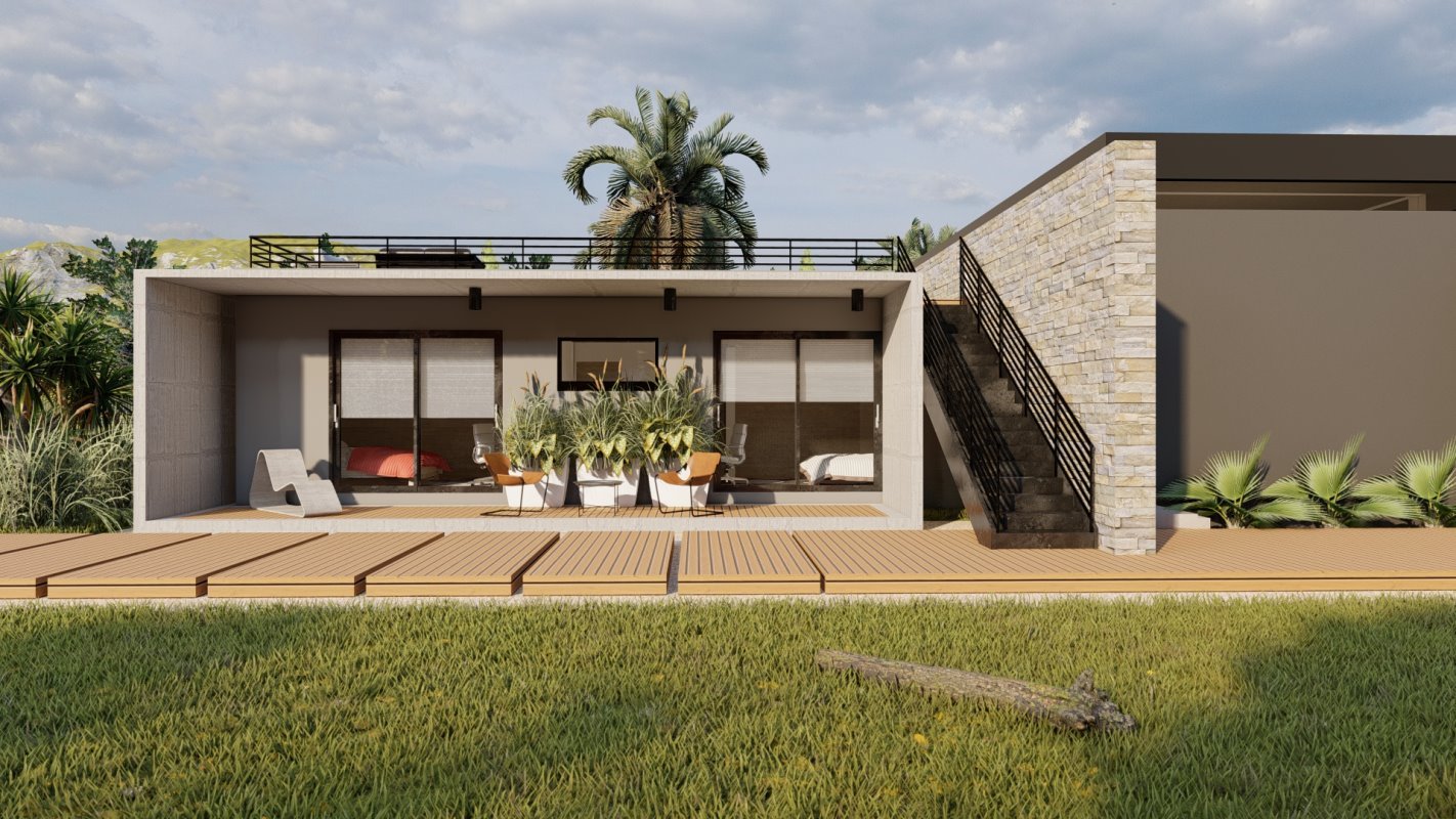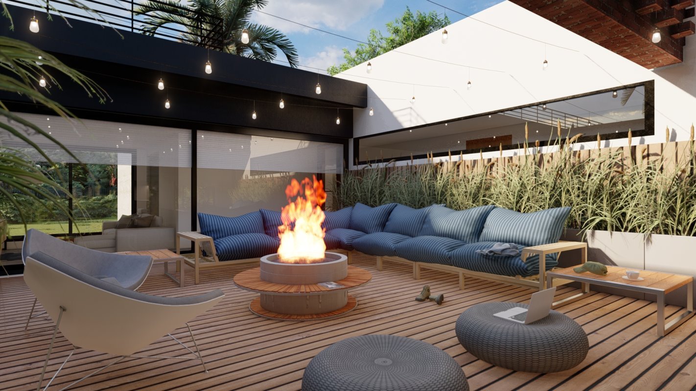 En la parte principal se diseña el quincho y la ubicación de comedor en madera rustica, este espacio conecta con una terraza semi cubierta que da espacio para el living exterior y zona de proyección exterior. Estas dos terrazas se conectan por medio de una fogón y matera perimetral para cubrir la pandereta de la casa. En una esquina se diseña el espacio para un jacuzzi exterior.