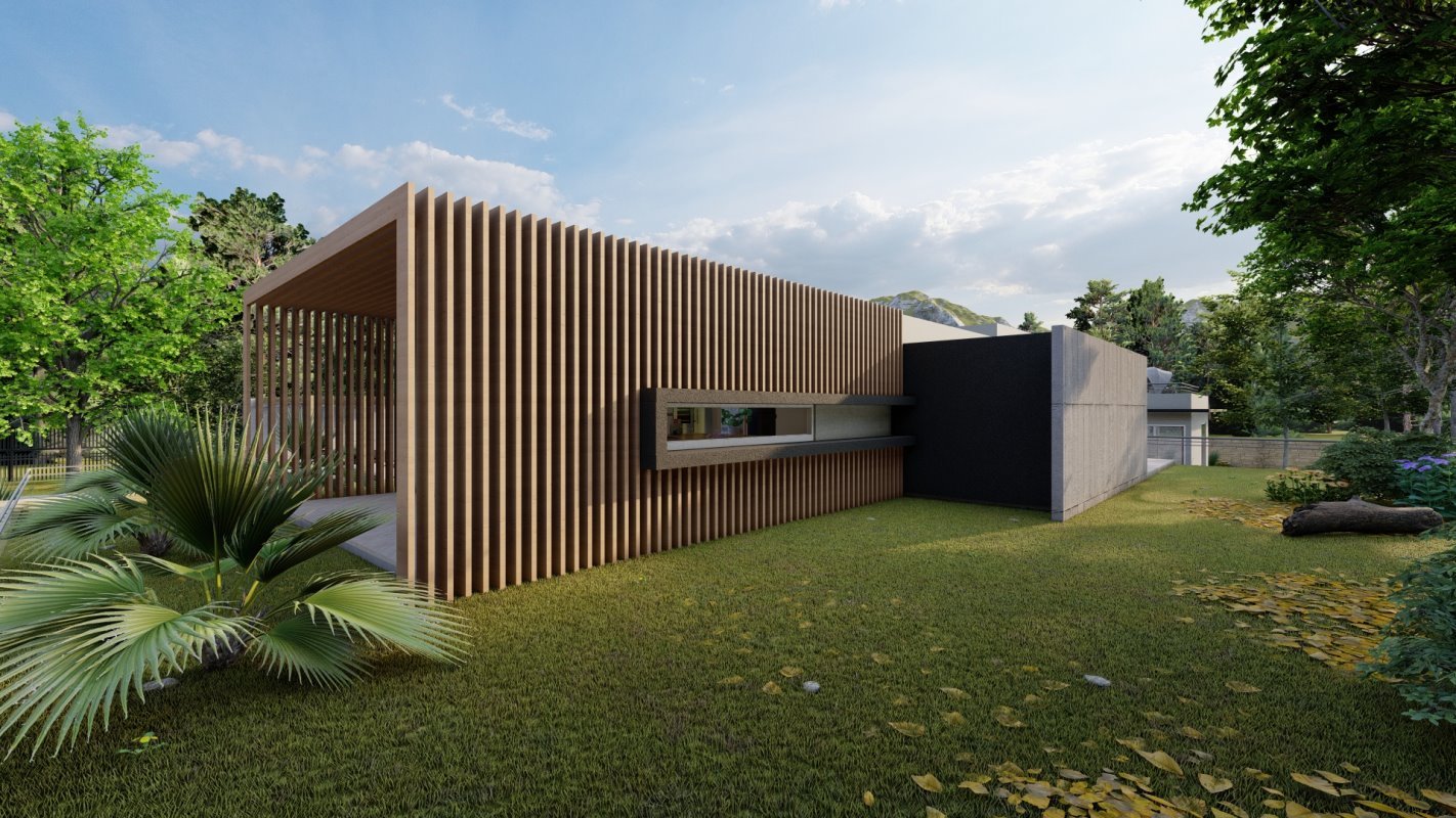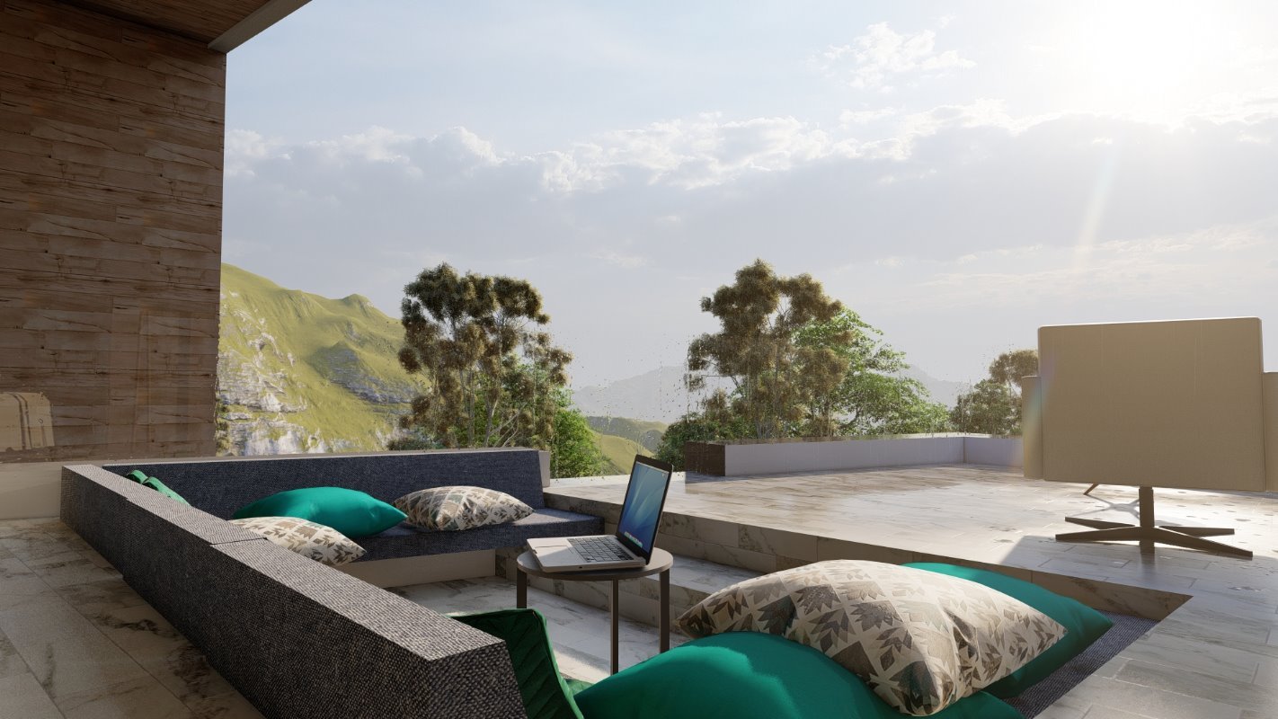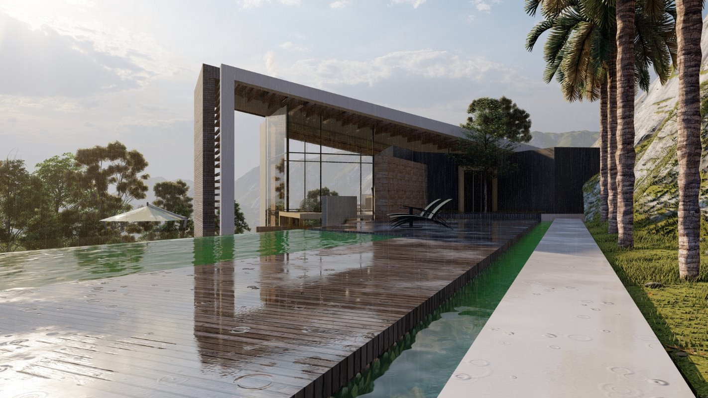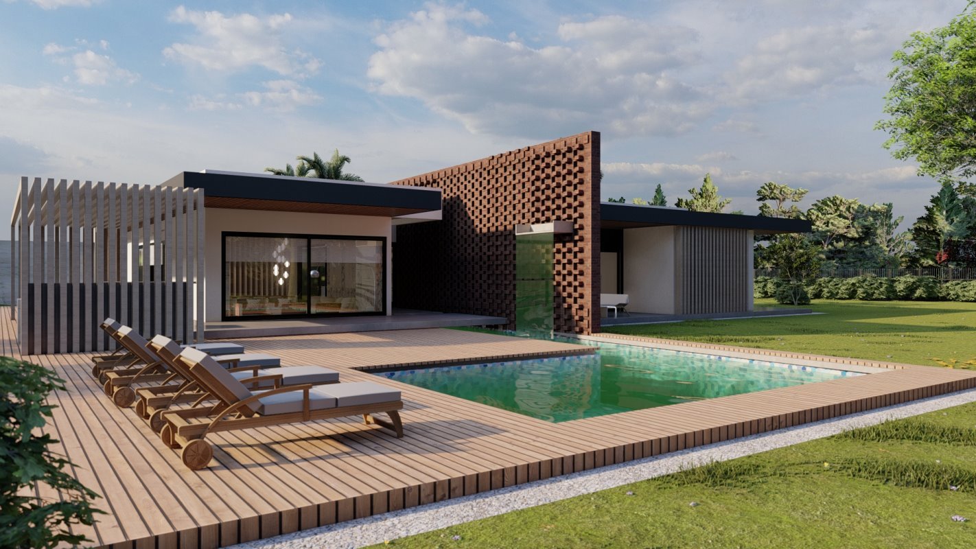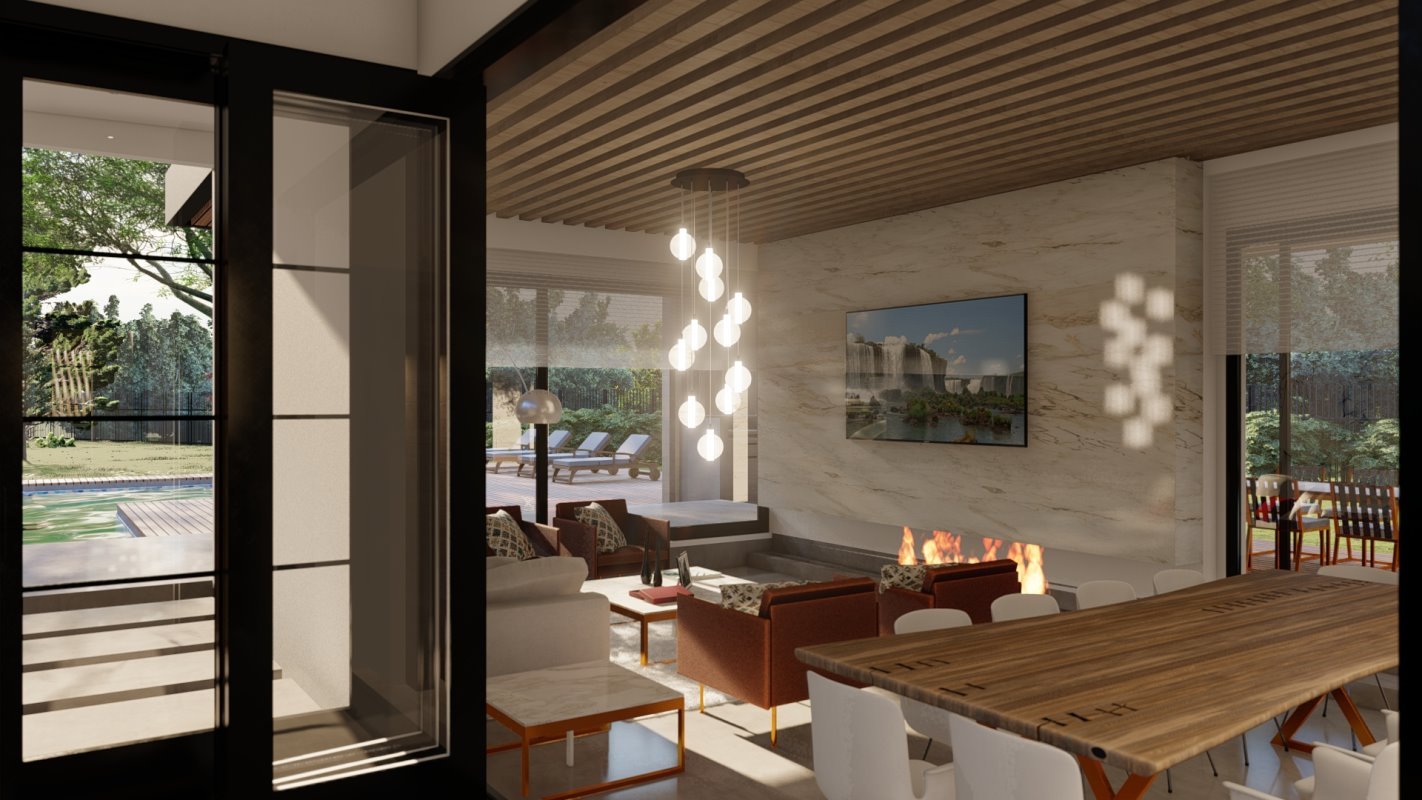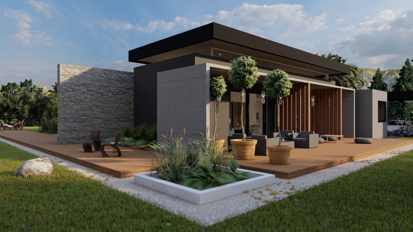 En la parte principal se diseña el quincho y la ubicación de comedor en madera rustica, este espacio conecta con una terraza semi cubierta que da espacio para el living exterior y zona de proyección exterior. Estas dos terrazas se conectan por medio de una fogón y matera perimetral para cubrir la pandereta de la casa. En una esquina se diseña el espacio para un jacuzzi exterior.