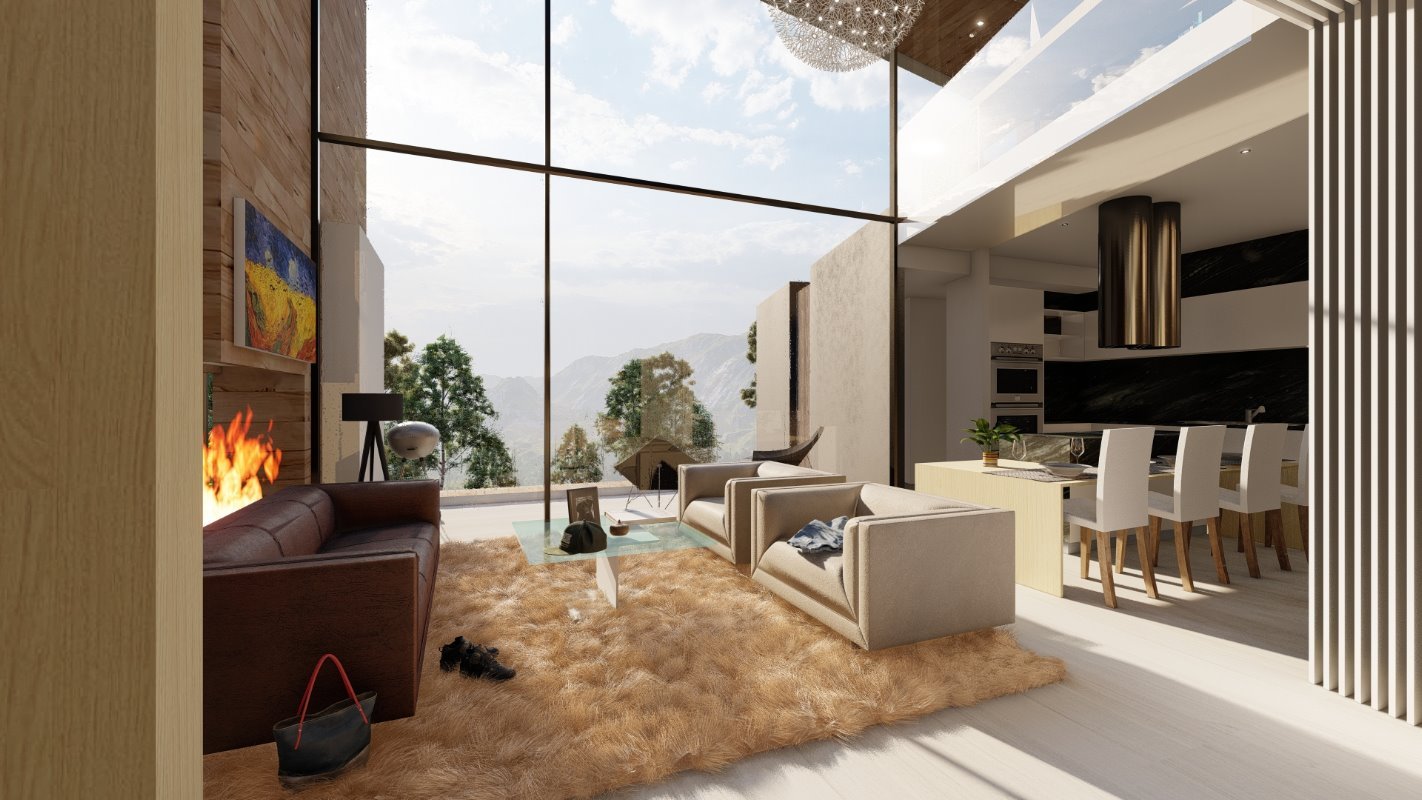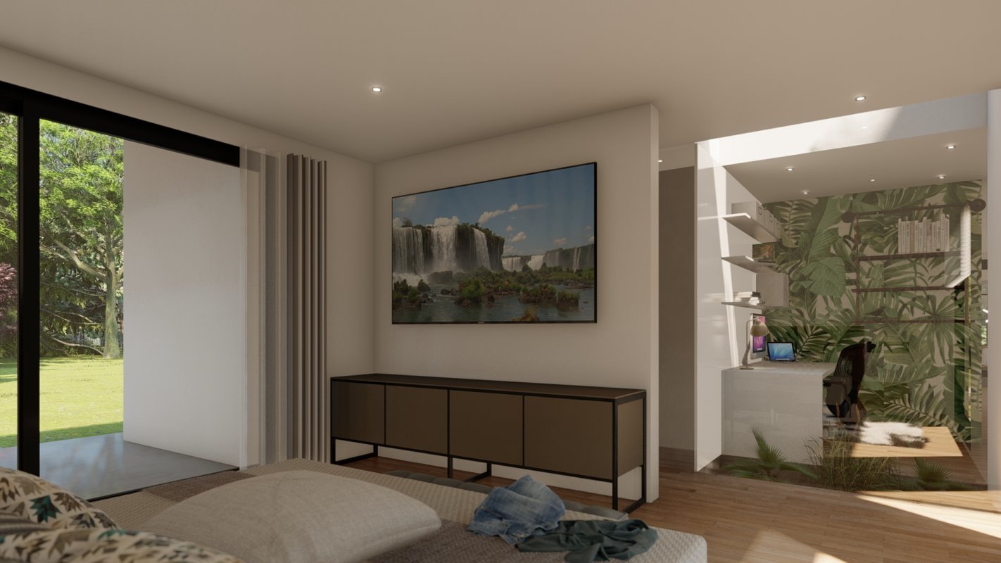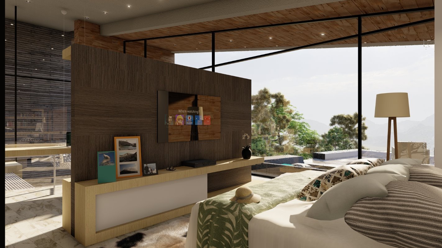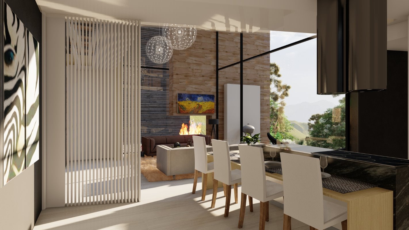 Era esencial distribuir la casa como una apartaestudio para él y su esposa separado de las habitaciones de los hijos y de invitados, es por esto por lo que la casa tiene 2 accesos independientes jugando con la topografía en colina del lugar. Un espacio de doble altura en living que conecta con la suite principal y un estudio semi integrado con la suite para el trabajo de telemedicina de sus dueños.