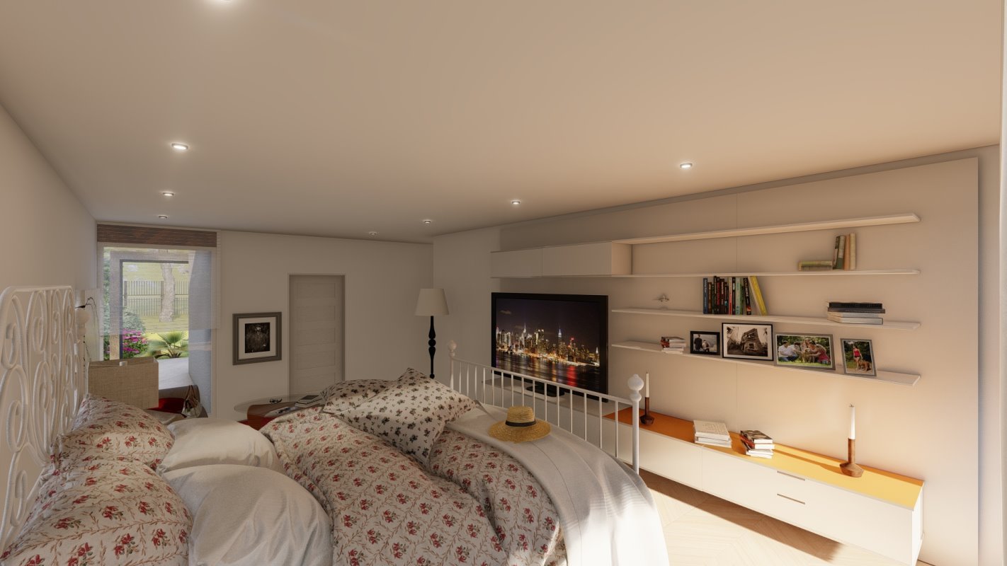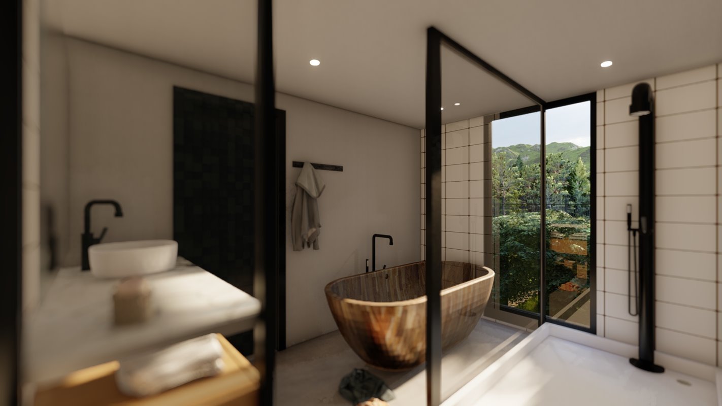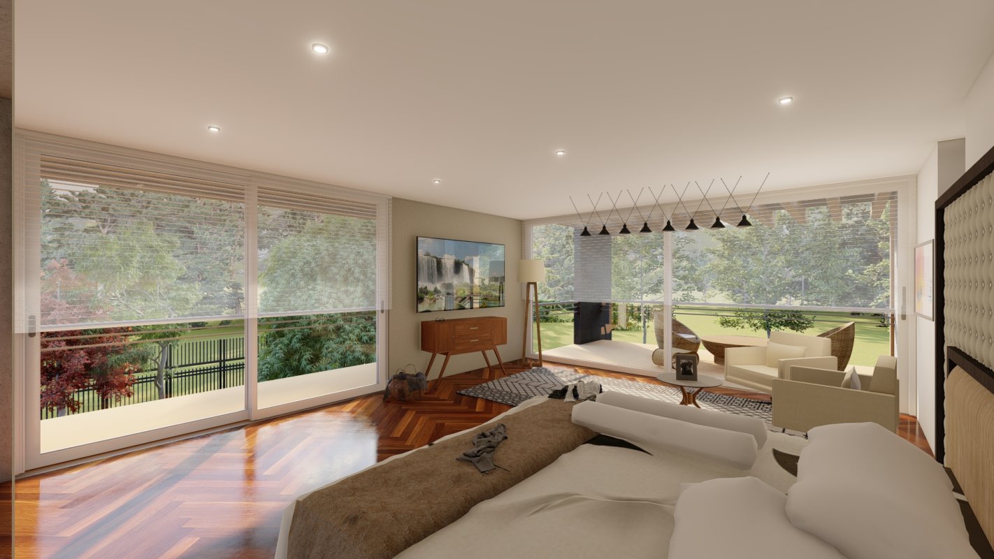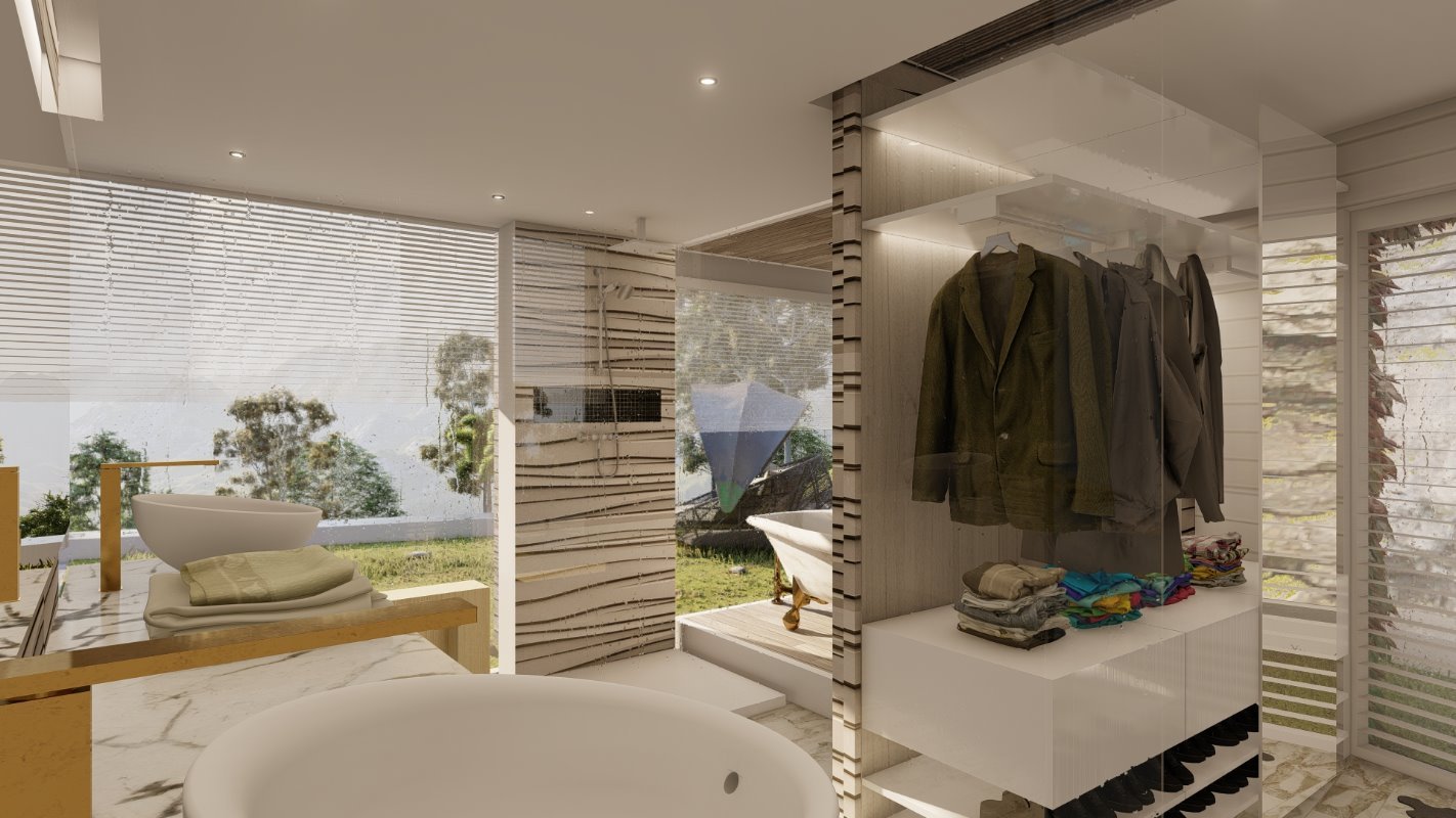 Era esencial distribuir la casa como una apartaestudio para él y su esposa separado de las habitaciones de los hijos y de invitados, es por esto por lo que la casa tiene 2 accesos independientes jugando con la topografía en colina del lugar. Un espacio de doble altura en living que conecta con la suite principal y un estudio semi integrado con la suite para el trabajo de telemedicina de sus dueños.