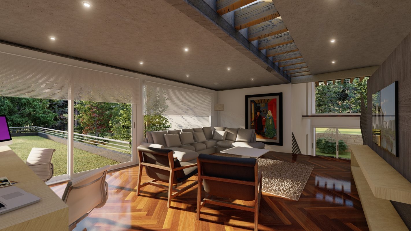 Se diseña un espacio de estudio con el living de habitaciones, que funciona como sala de música y espacio de uso para los eventos sociales que se desarrollan en una terraza que conecta la parte social y el espacio de música.
