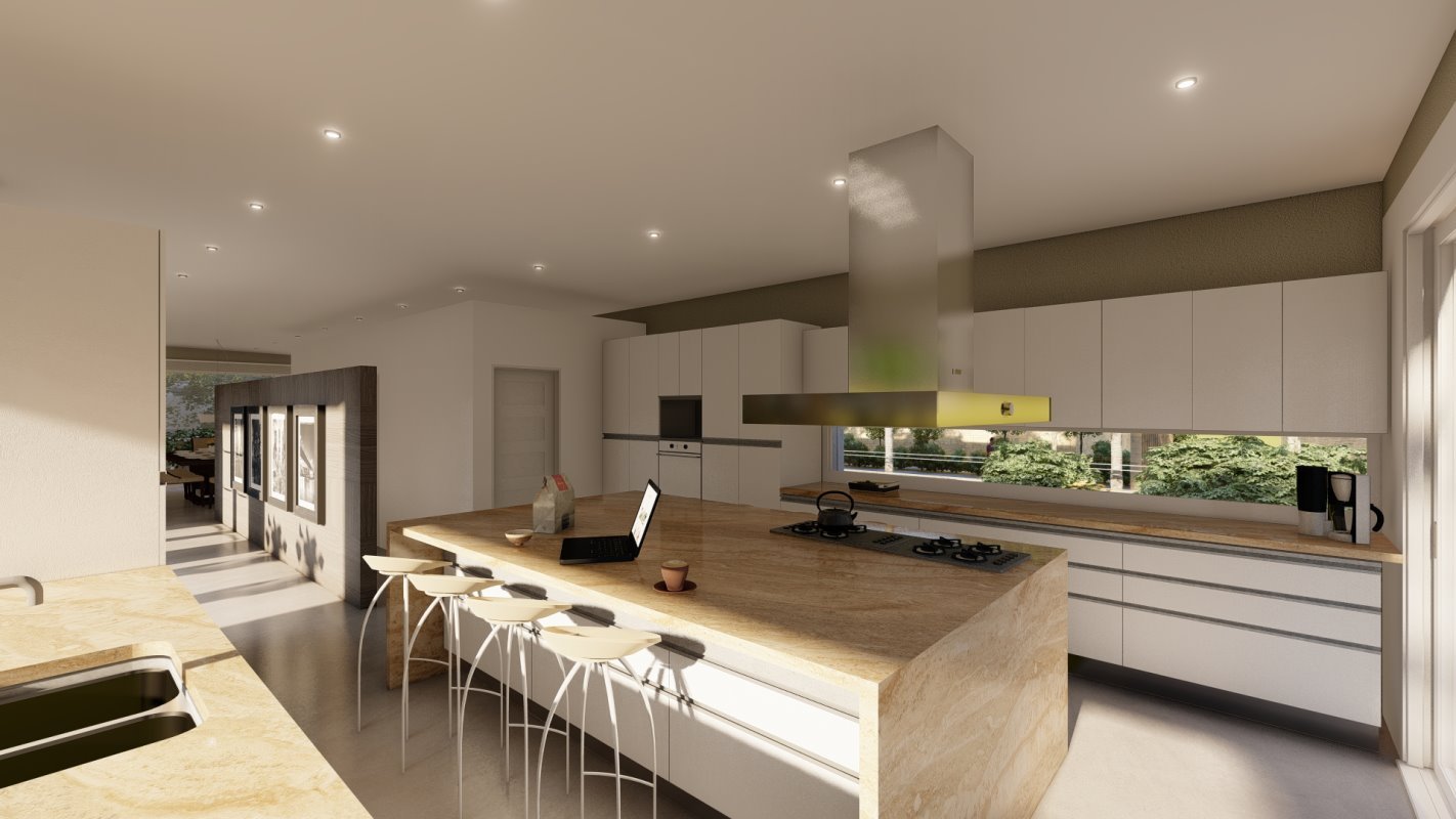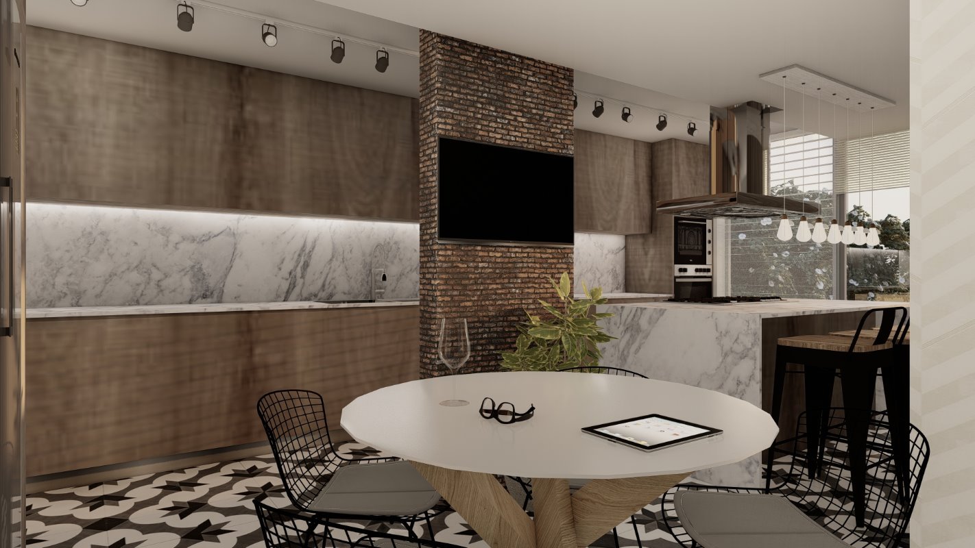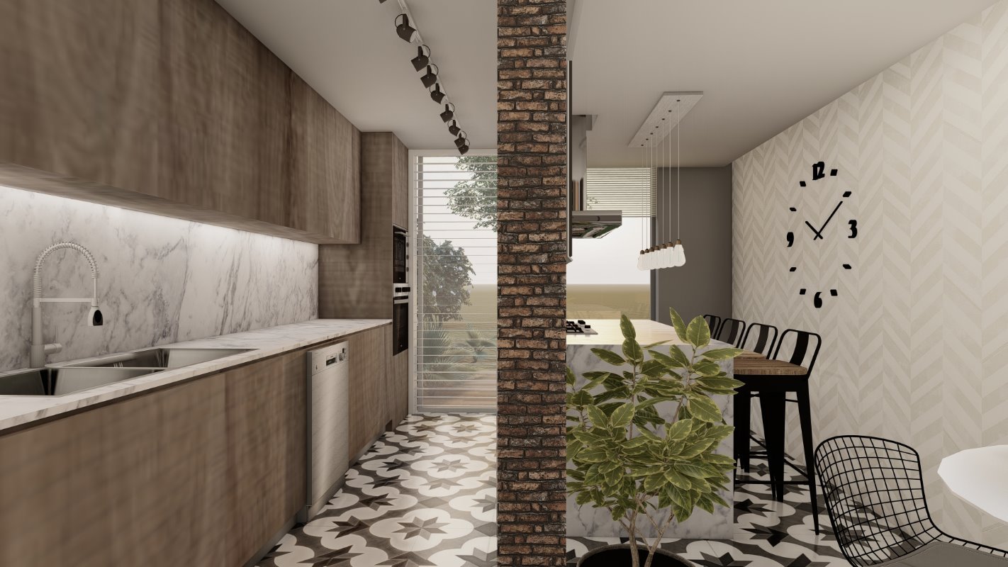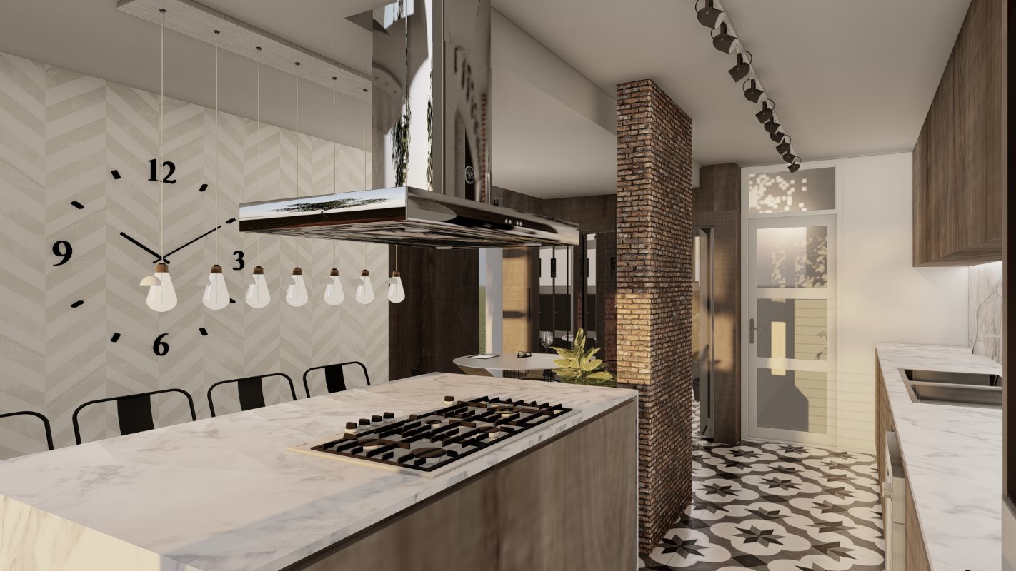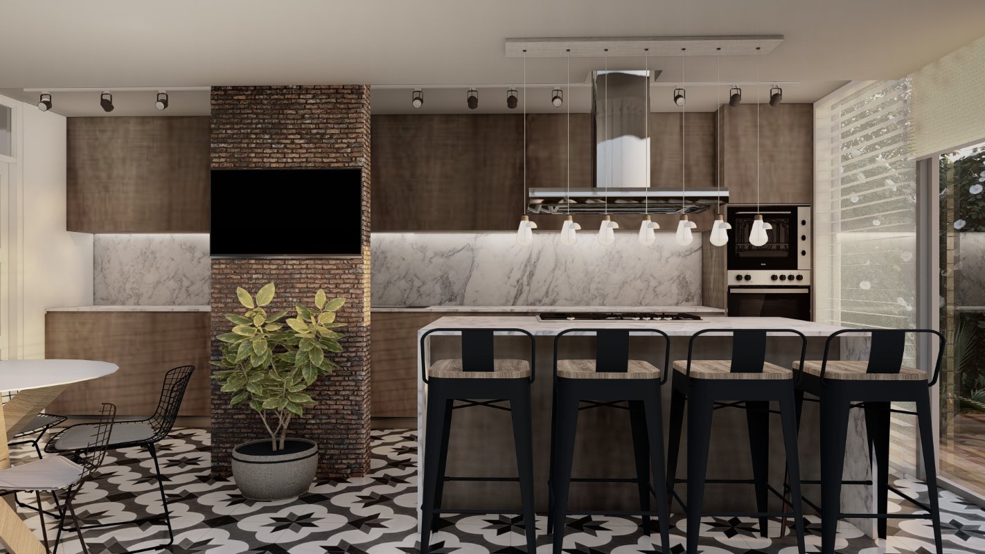 COLOMBIA, CHILE. Descripción El diseño interior de esta cocina involucra 3 espacios de la casa que no estaba siendo utilizados de una forma ideal. Se unen los espacios y se crea una cocina mas abierta con isla y con posibilidad de almacenamiento adicional. La idea principal de la cocina es generar un espacio de estancia y disfrute de los habitantes del hogar, proporcionando la comodidad para cocina y comer. 3 2.5 15 mt2