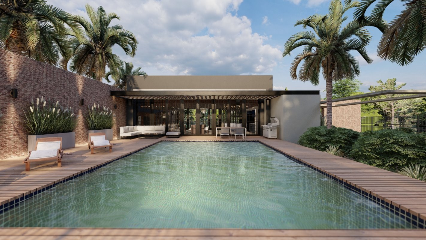 La casa se complementa con un gimnasio, la suite principal y dos habitaciones secundarias. La terraza cuenta con un quincho y una piscina en L.