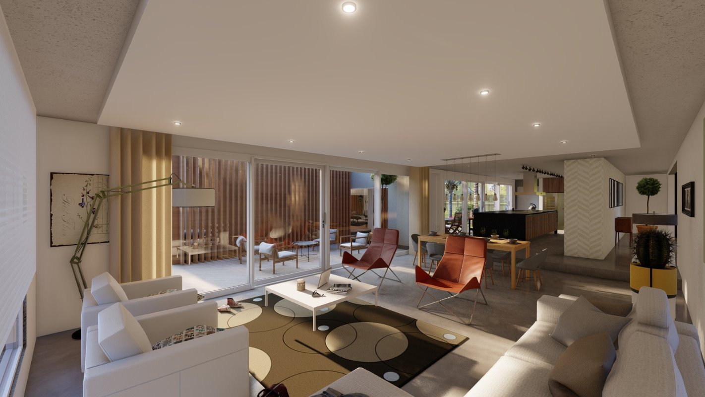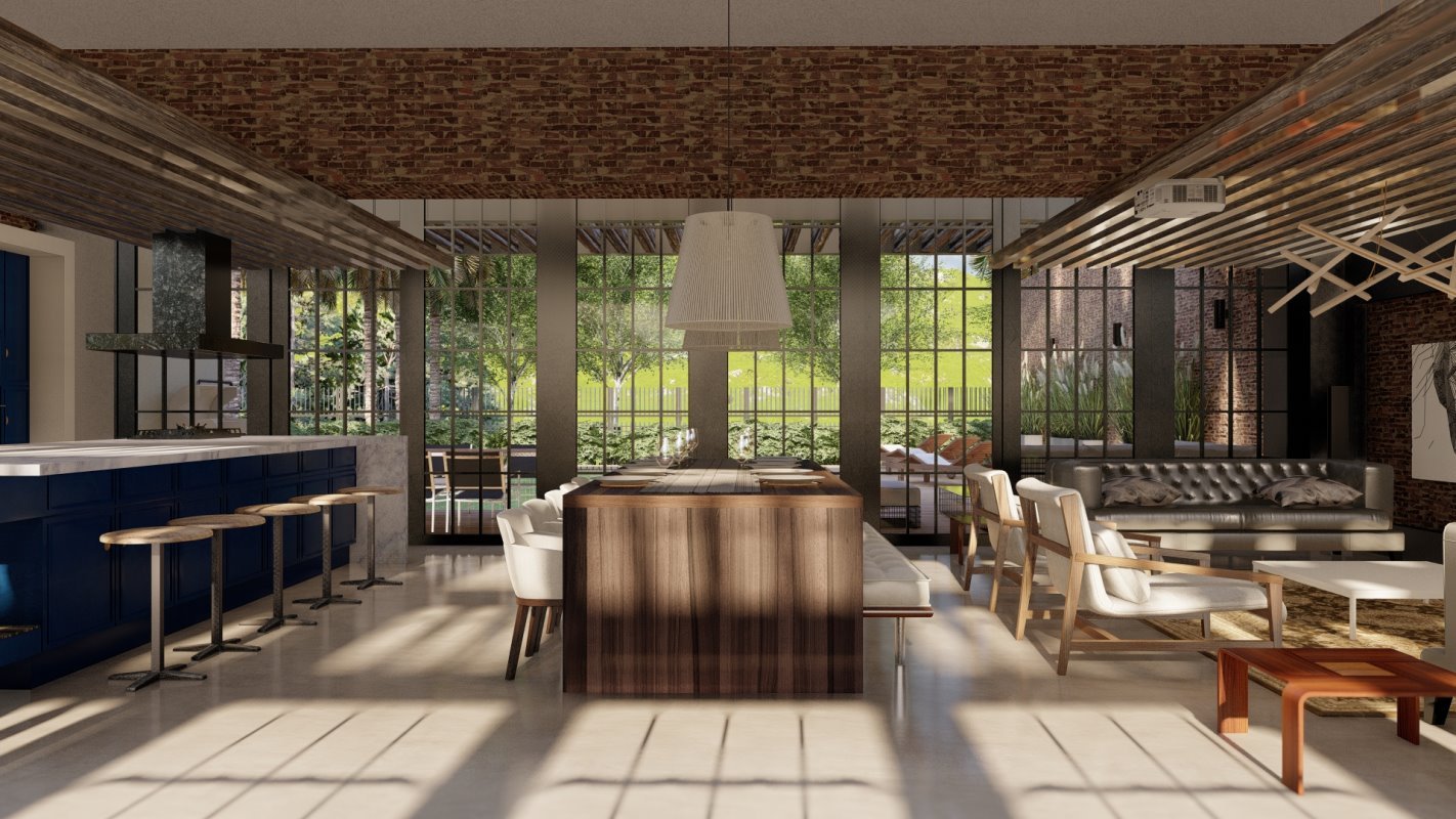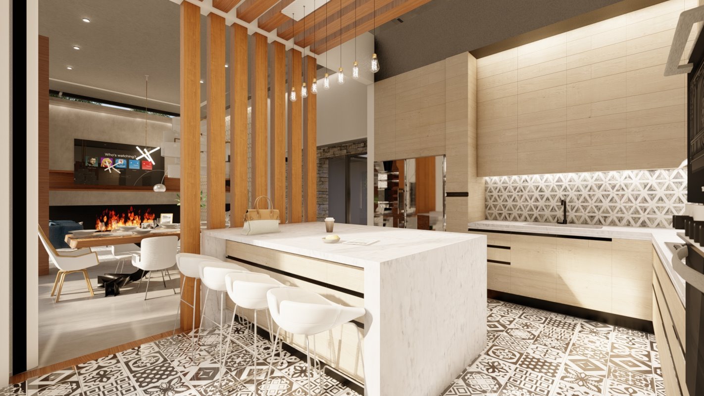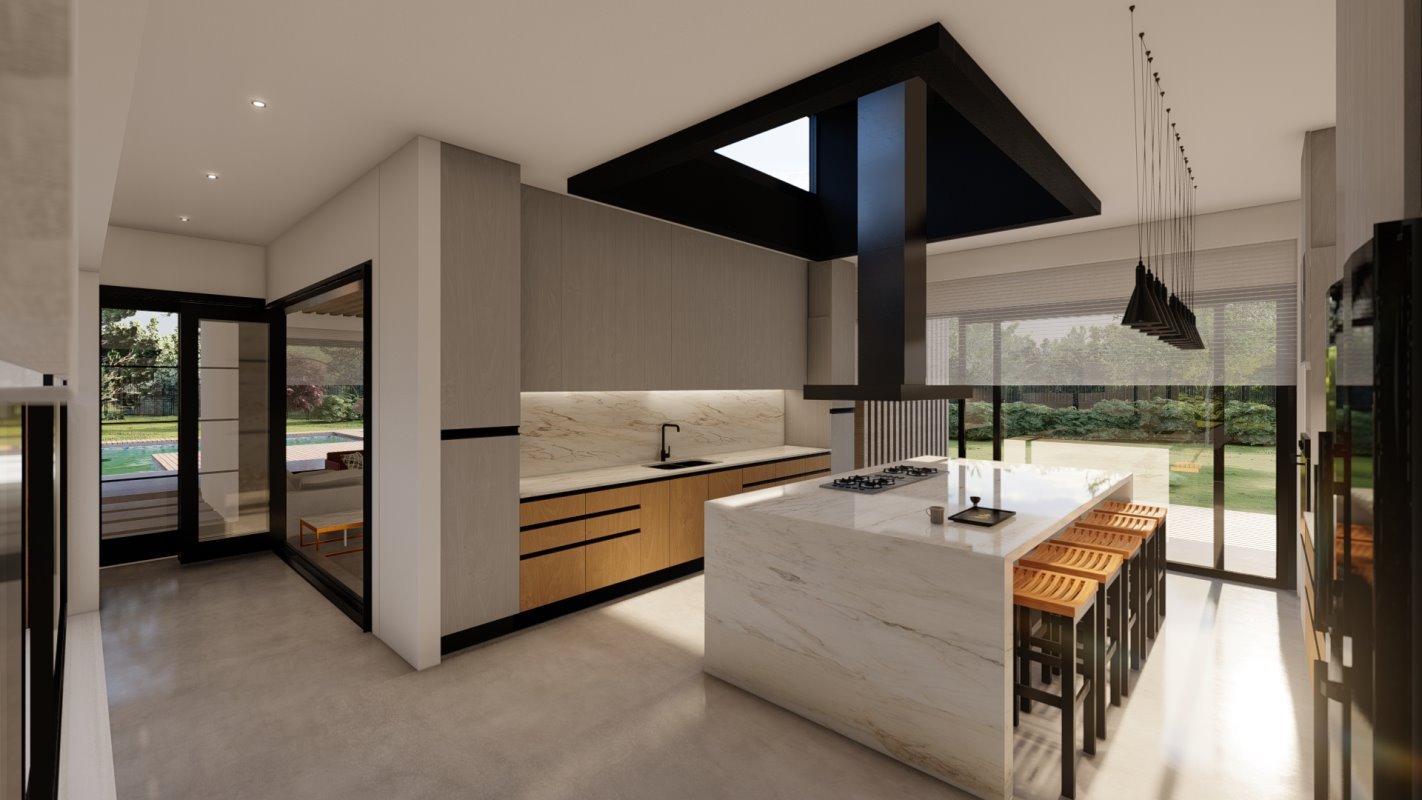 Desde el acceso un muro nos guía hacia un espacio común donde se distribuyen los espacio de living, comedor y cocina abierta con isla.