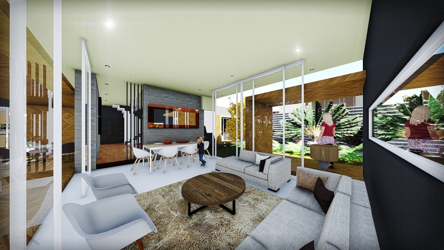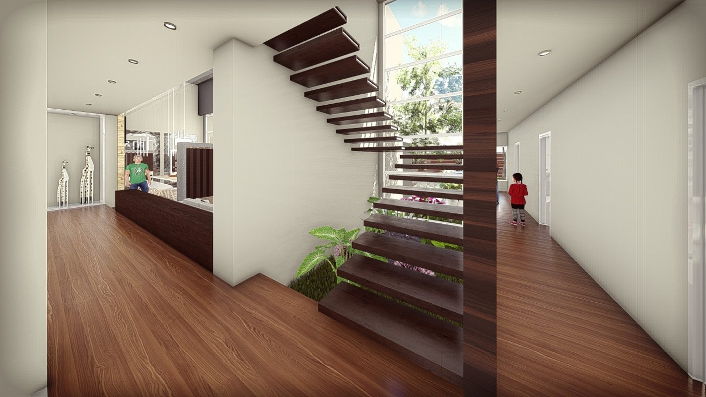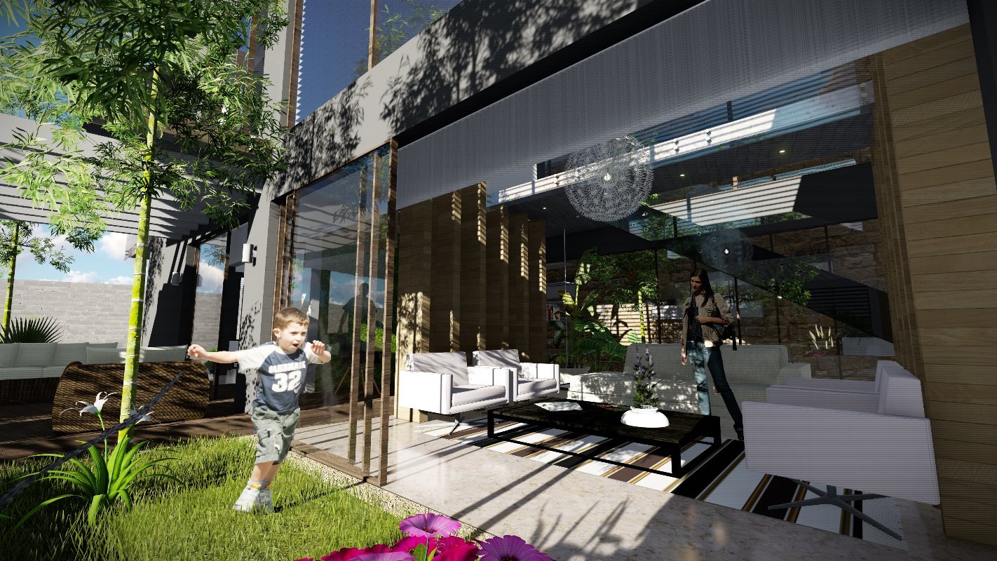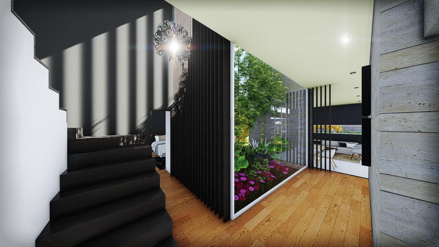 Es diseña a partir de un patio central que distribuye los espacios interiores de la casa, siendo lo mas importante para el cliente las actividades sociales. Diseñada en un lote de 550m2 al interior de un condominio y cuenta con 250 m2. En el primer nivel una doble altura en living con escaleras en estructura metálica que dan servicio al segundo nivel.