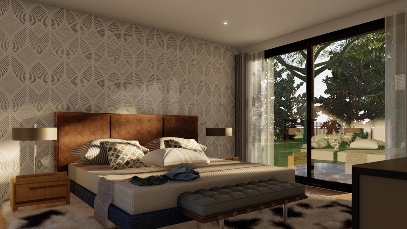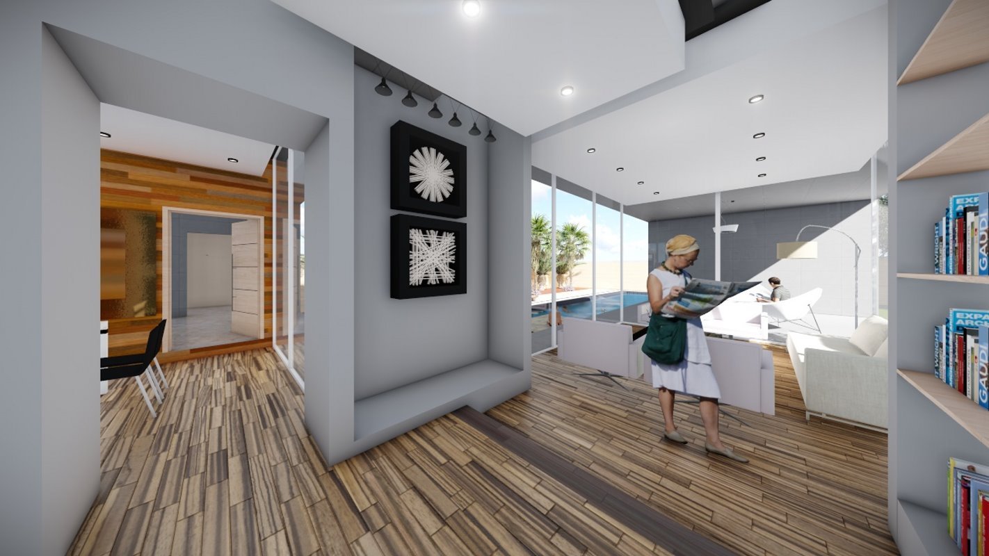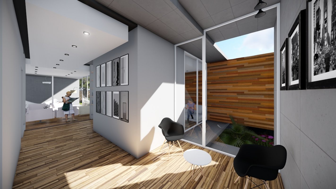 Desde el hall de acceso hasta la suite principal se conectan visualmente por medio de un patio interior, diseñada para los tiempos de hoy cuenta con una oficina dentro del diseño y un acceso amplio para dejar los objetos.