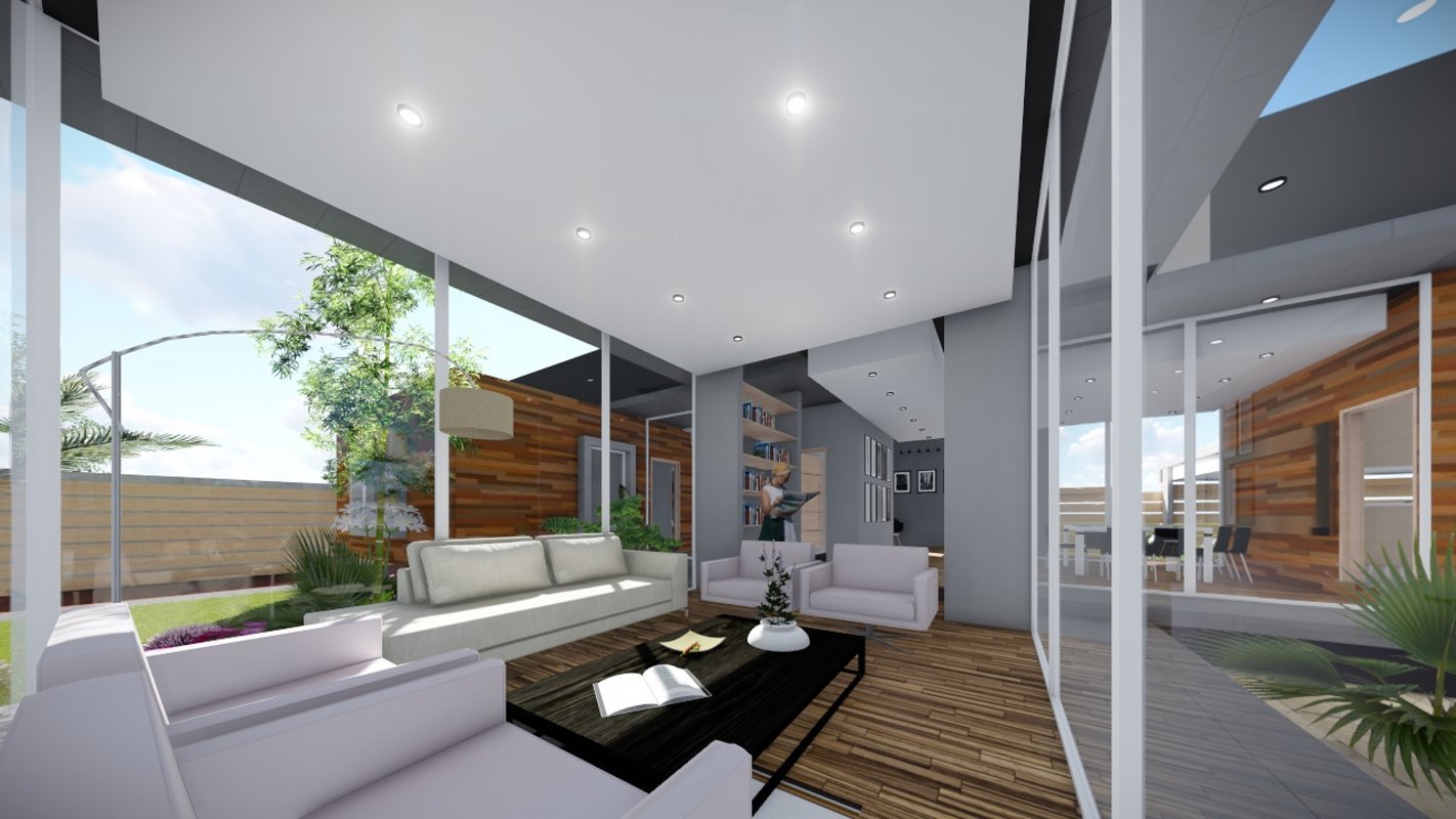 VI REGION, CHILE. Descripción Casa de 1 solo nivel, se emplaza en forma de T, donde el espacio predominante es una sala multiusos que cambia su carácter dependiendo del uso, puede ser una sala de cine o un espacio abierto con el exterior. Se diseña un estudio con un patio interior para toda la familia.